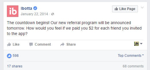 Don’t hide your referral program. If you want people to join, it needs to be seen – this is important for promoting pre and post-launch! See how Ibotta used a countdown to gain excitement for their new referral program? look at all those “Likes”.