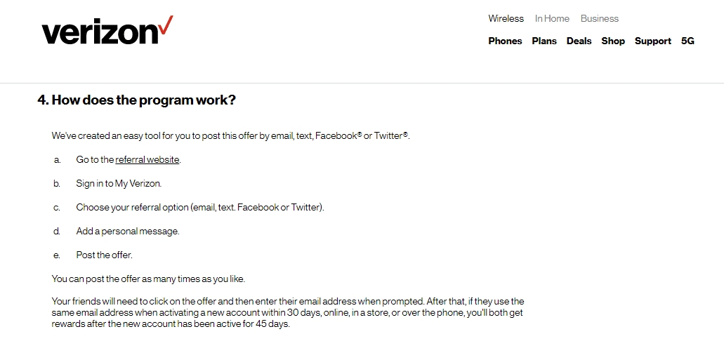 Here’s how Verizon answers this question in their referral FAQ. Notice how they list their available referral options: email, text, Facebook or Twitter. Also, they call their referral program an “easy tool!”