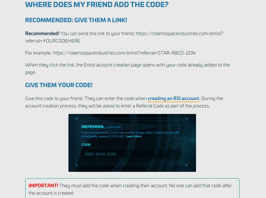 Here’s an example answer from the Roberts Space Industries referral program, which uses both links and codes to make referring simple.