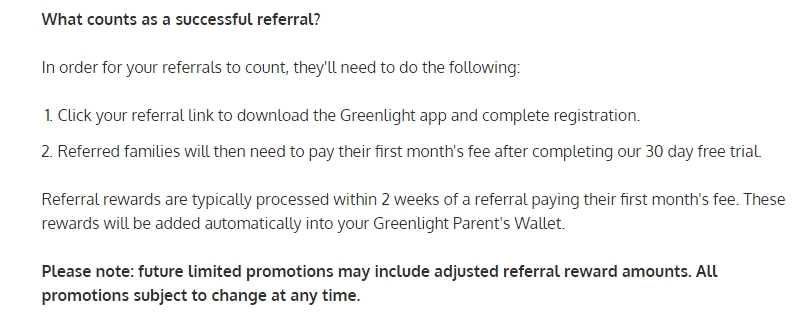 In this example from Greenlight, referred friends must pay for the first month of their subscription for a referral to be successful. Successful referrals earn both the referrer and friend $10.