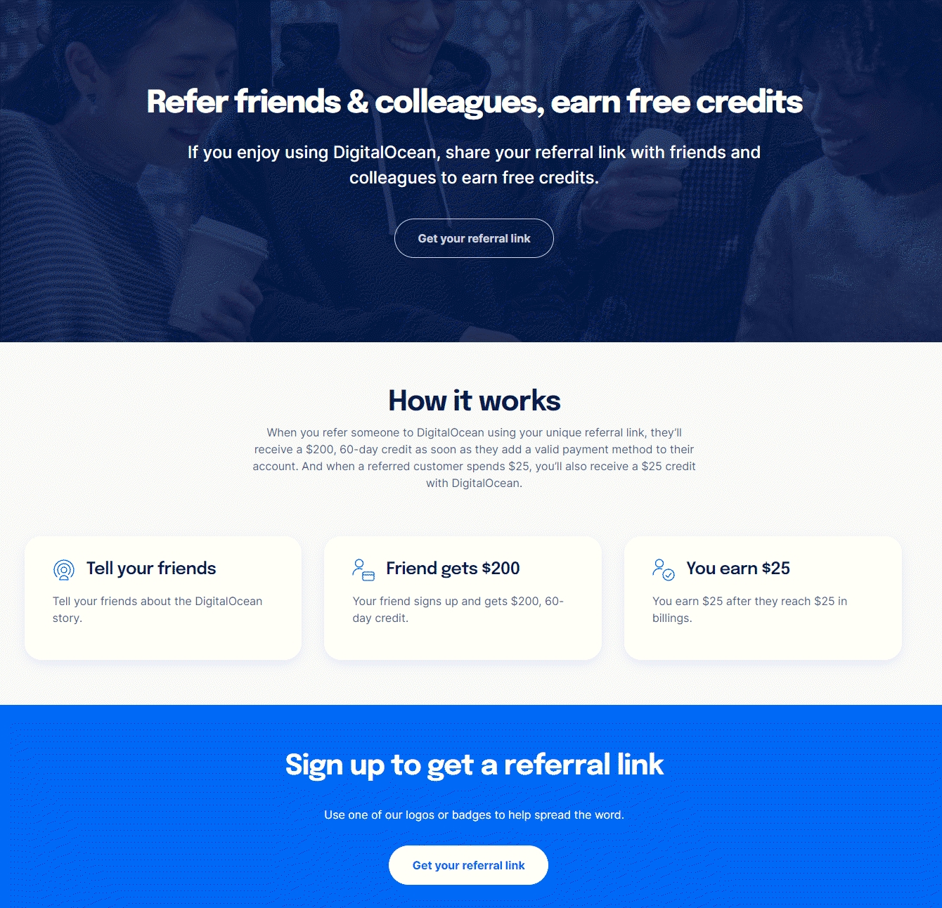 When a customer clicks an email invite link for Digital Ocean’s referral program, or finds a link via the website homepage, they are brought to the referral landing page. The page gives a clear description of the program, outlining how customers and their friends earn rewards in three steps.