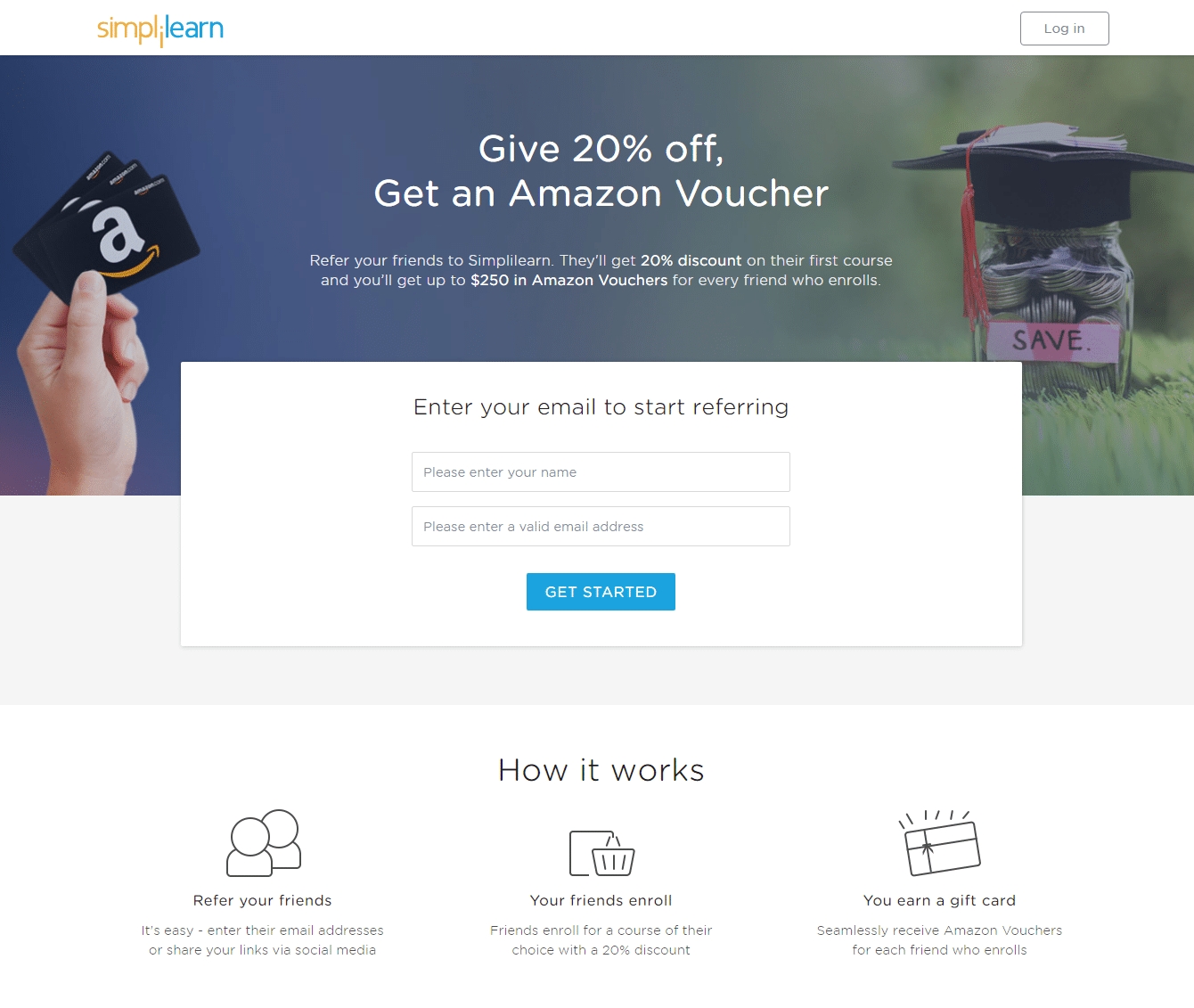 This program offers different rewards for the advocate and their friend. For instance, the friend might receive $20 in store credit when they make their first purchase, while the advocate receives a thank you gift box. Or, like in the example below, the friend might get 10% off while the advocate gets Amazon gift cards.