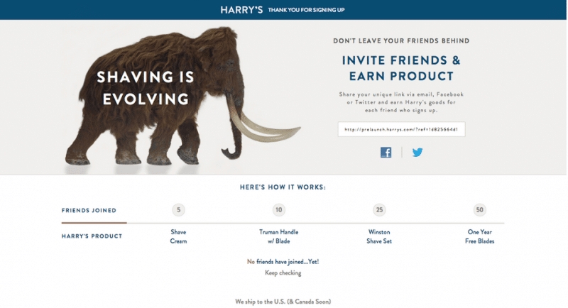 Razor company Harry’s used this strategy when they first launched their ecommerce site. They offered tiered rewards, ranging from free shaving cream to an entire year of free blades. And they received an amazing response – 100,000 emails gathered in a single week!