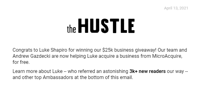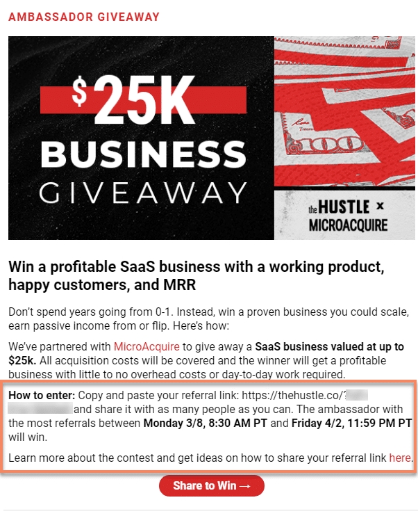Running a referral contest is another way to get customers excited to join your refer-a-friend campaign. Just like any contest, this works best when the prize is a high-value, sought-after product or service. We’re talking big-ticket items like the latest smartphone, premium event tickets, or even business ownership rights (as The Hustle offered in their newsletter referral program).