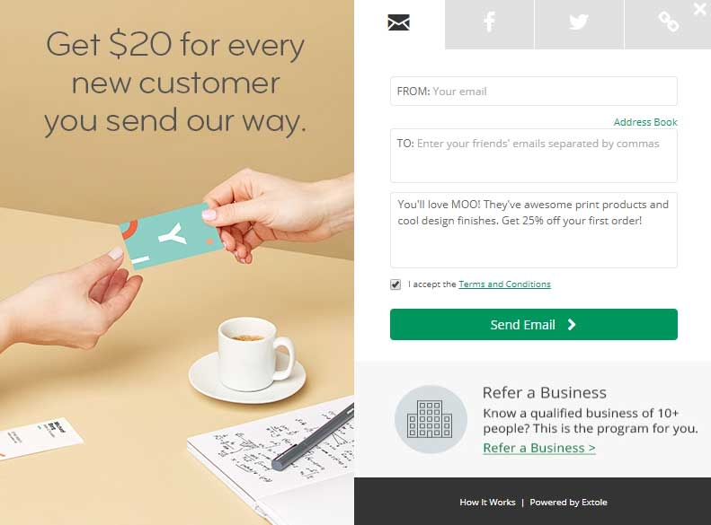 In the example below, design and print company MOO offers its customers $20 for every qualified referral. Customers are entitled to a maximum of 500 referrals (up to $10,000 in earnings!) per year. This opportunity automatically renews at the start of each calendar year.