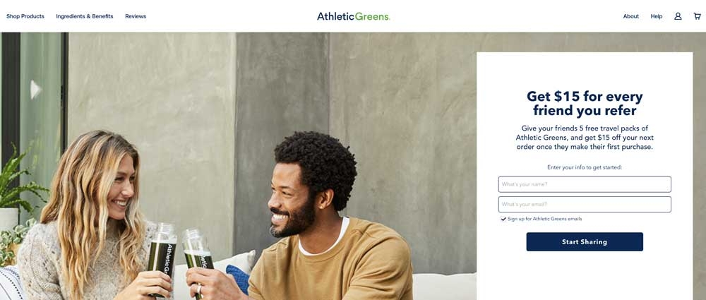 What type of referral reward? The current customer gets $15 off their next order for every friend they refer, and the referred friend gets five free travel packs of Athletic Greens with their first purchase