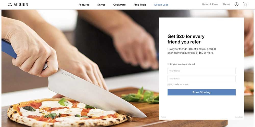 As a Kickstarter alumni, Misen offers high-quality kitchen tools at honest prices. As one of the pioneer DTC (direct-to-consumer) brands, Misen operates an ecommerce store and invites customers to share its products with others through an attractive DTC referral program.