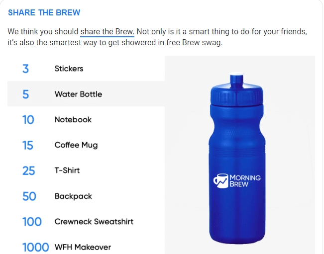 “Share the Brew” is the catchy referral phrase used by Morning Brew, a free newsletter geared toward young professionals.