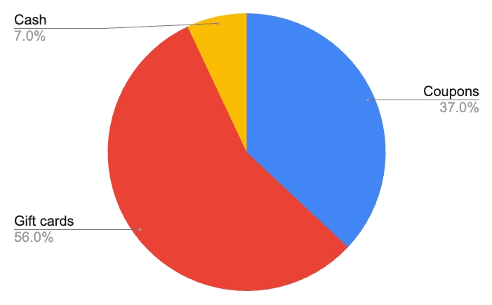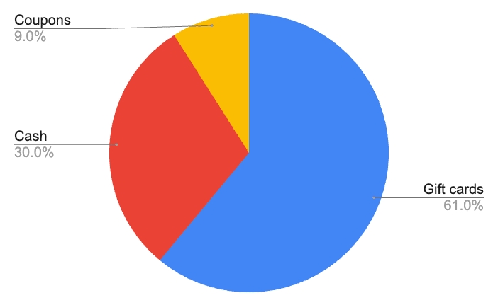 The most common rewards for members (aka customers or affiliate partners referring customers) were gift cards (61%), followed by cash (30%), and coupons (9%).