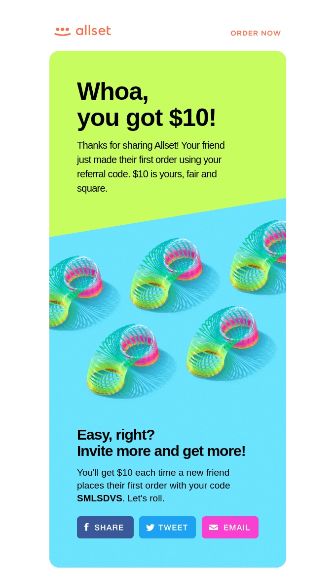 People get busy. Sometimes, they really want to share your brand and earn rewards, but can’t think of someone to share it with. And then… well, they forget about your program. It happens! So, it’s good practice to send out reminder emails to people who signed up for your program but haven’t shared within a certain quarter.