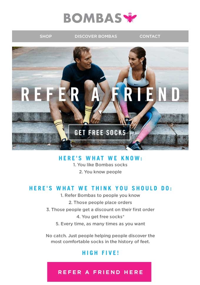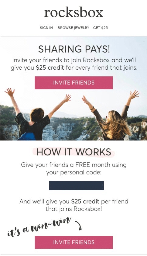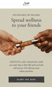 Yes, your referral program (and its opportunities to earn rewards) should be ongoing. But an email related to an upcoming holiday or season can inject some variety into your promotions. This might mean a “share the love” email specifically timed near Valentine’s Day – or a “Friends-Giving” email near Thanksgiving.