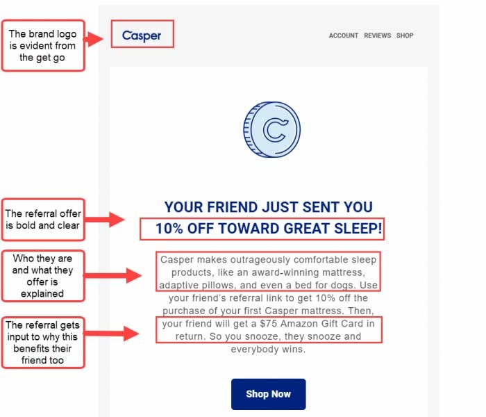 The Casper referral program has played a big part in why the brand grew so popular in a relatively short time. With great branding and a referral discount, Casper has been on a roll. The referral message is straightforward, but also shares a little more detail than some other companies.