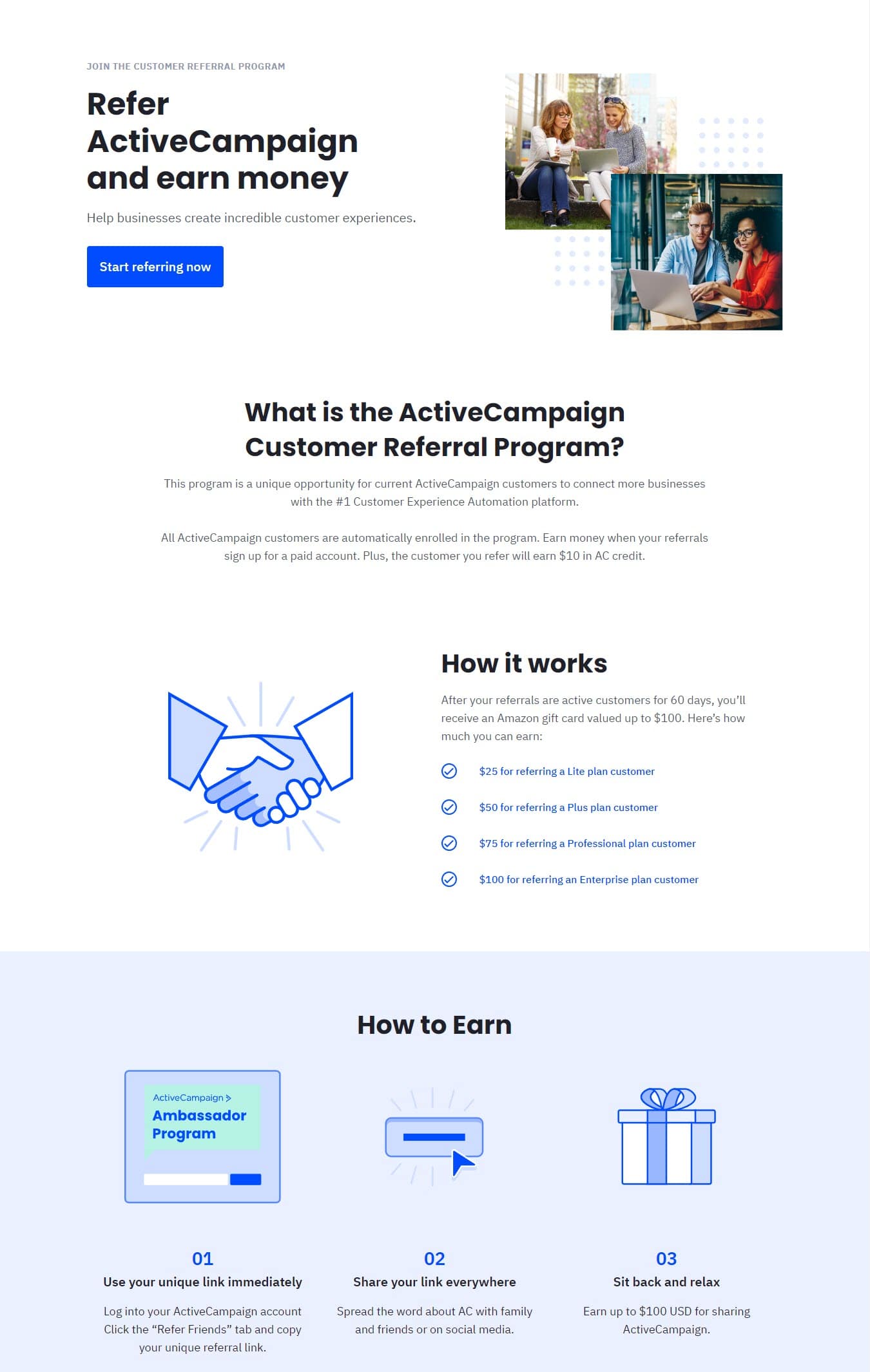 We also love that stakeholders earn rewards based on the value a newly referred ActiveCampaign brings to the company. Incentives range from $25-$100 in Amazon credits, based on the cost of the plan the referred customer bought.