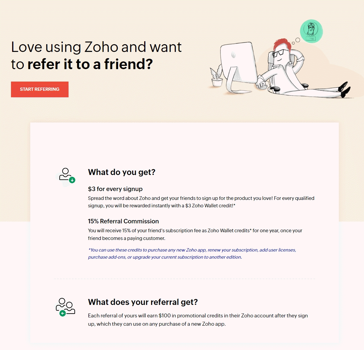Zoho’s referral program offers product credits in exchange for successful referrals.