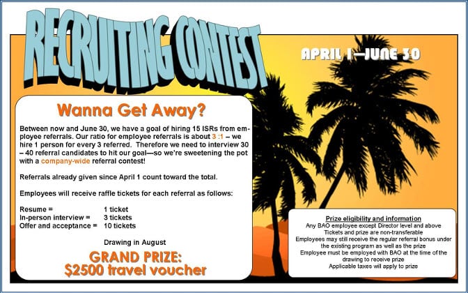 You can also reward your employees with something they already love: fully-paid trips. Of course, these should be saved for the most impactful referrals, since they’re expensive to pay out. .